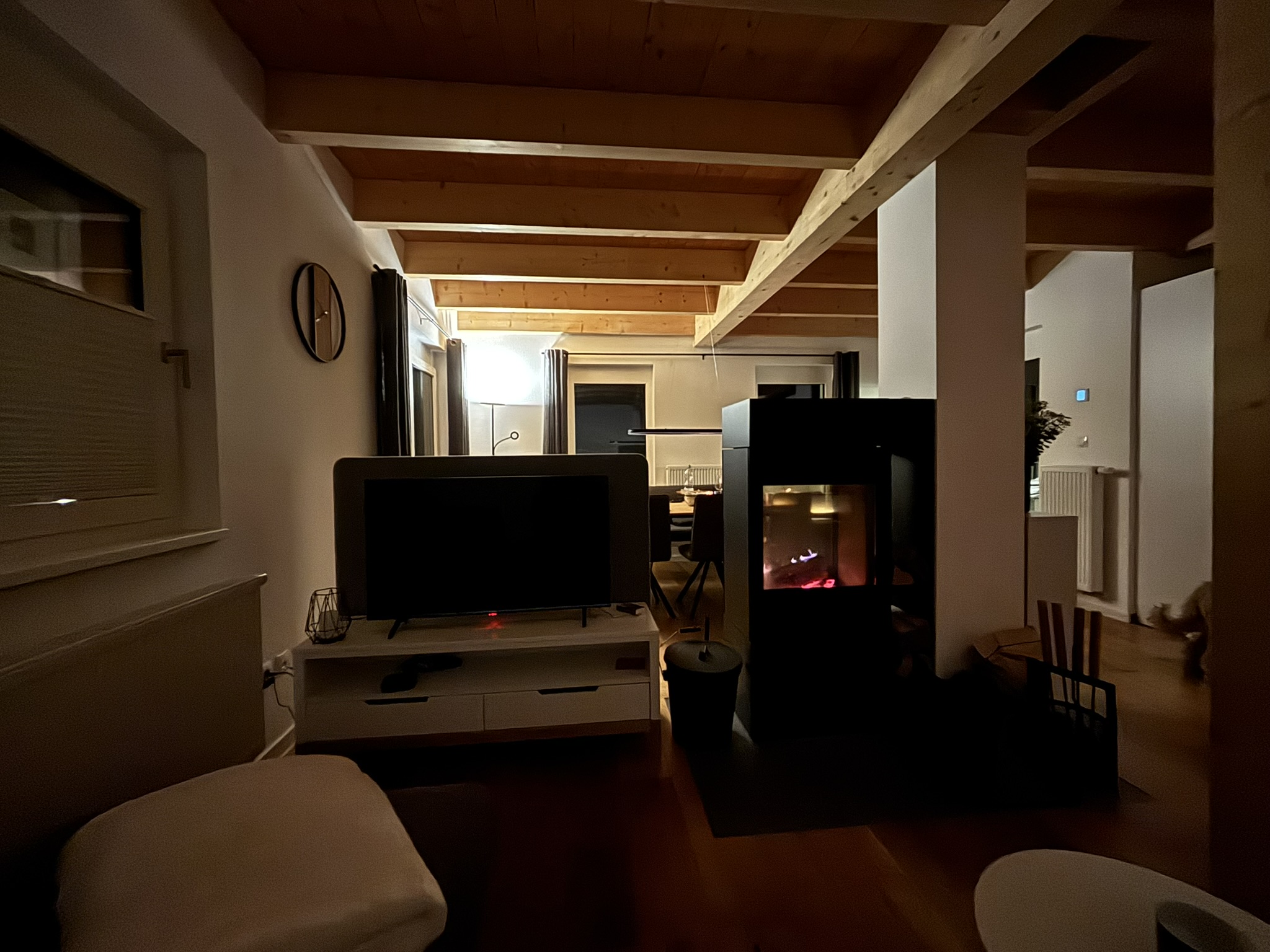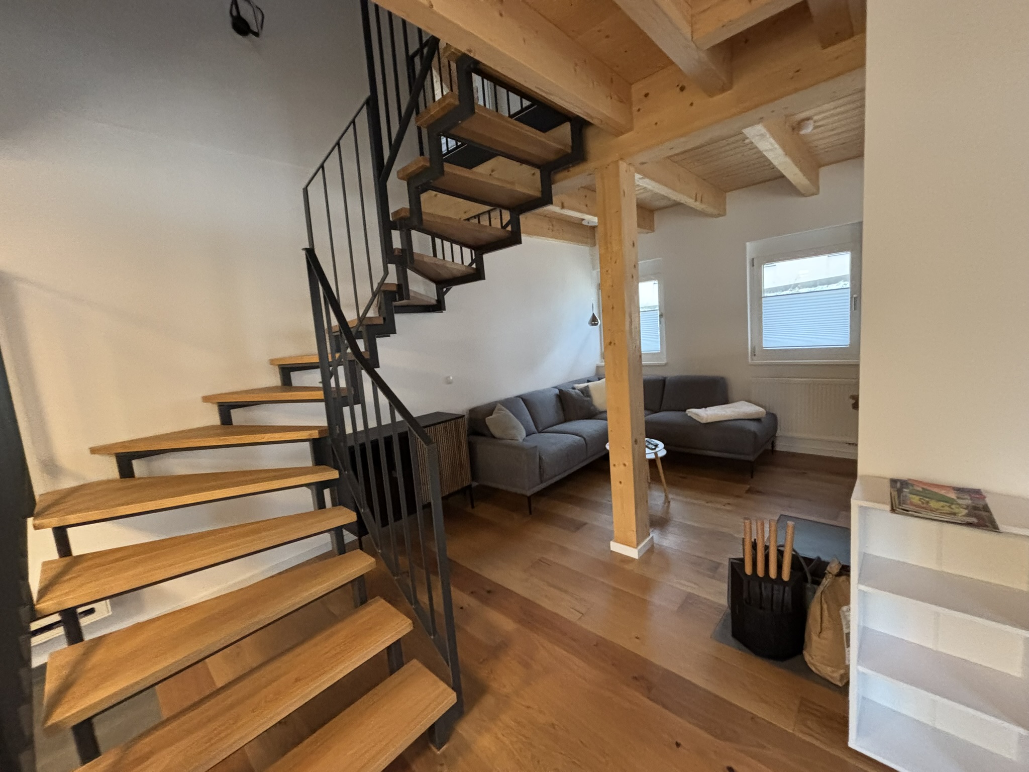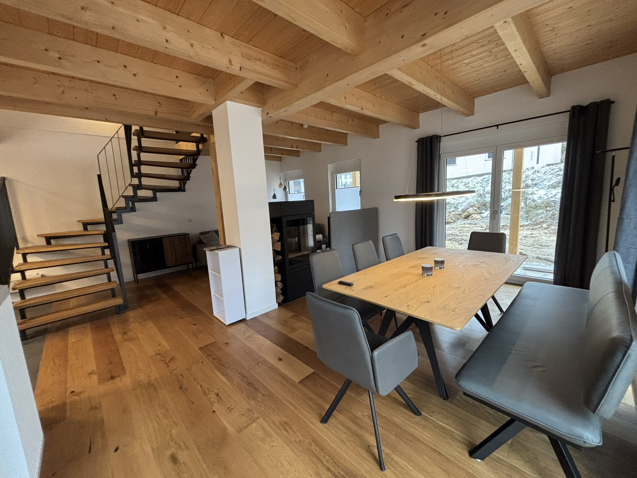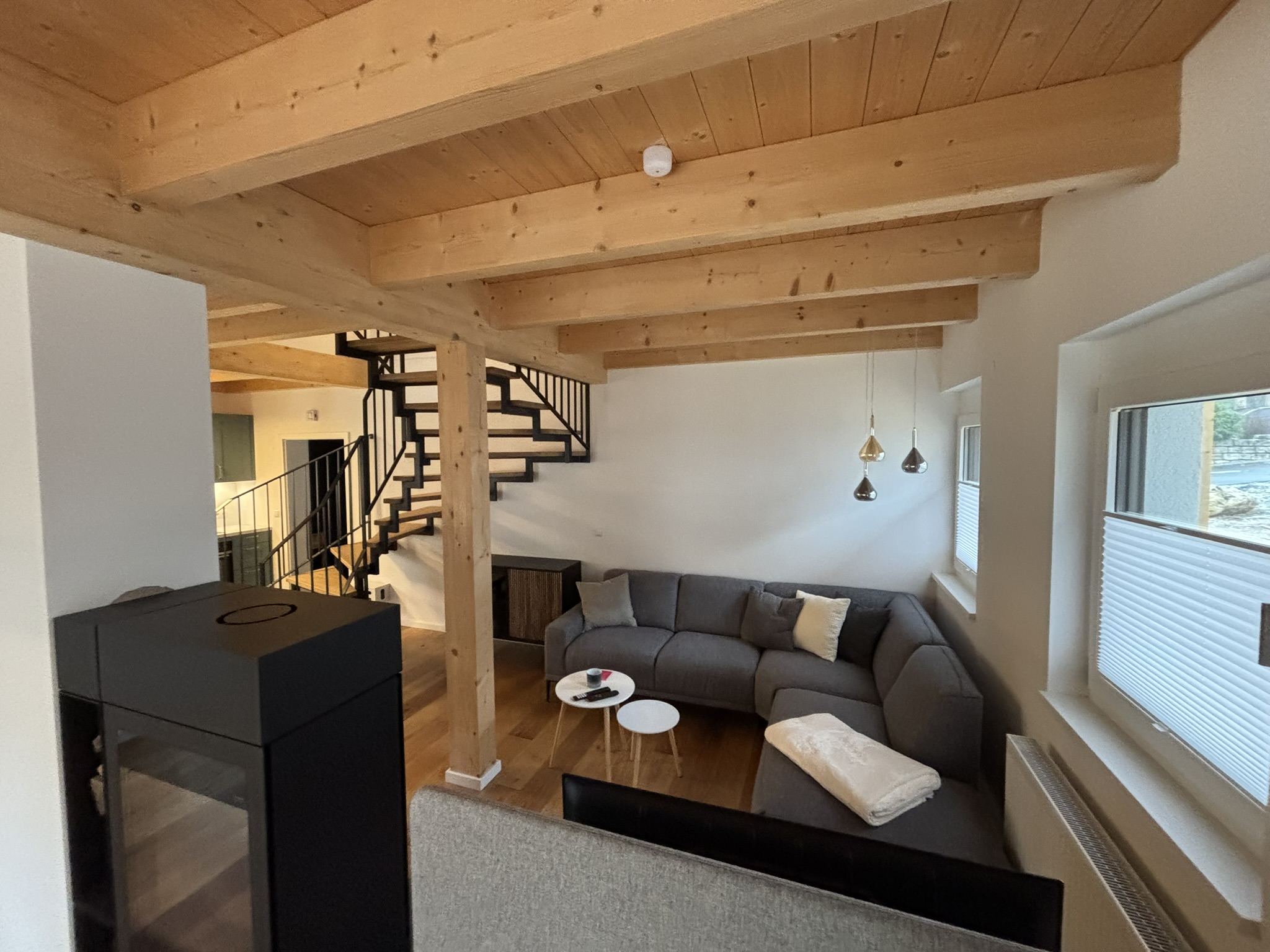 Unser Haus besticht durch eine offene Holzbauweise, die eine warme und einladende Atmosphäre schafft. Der gemütliche Holzofen im Wohnzimmer lädt zu entspannenden Abenden ein, während die Sauna Ihnen wohltuende Erholung bietet.