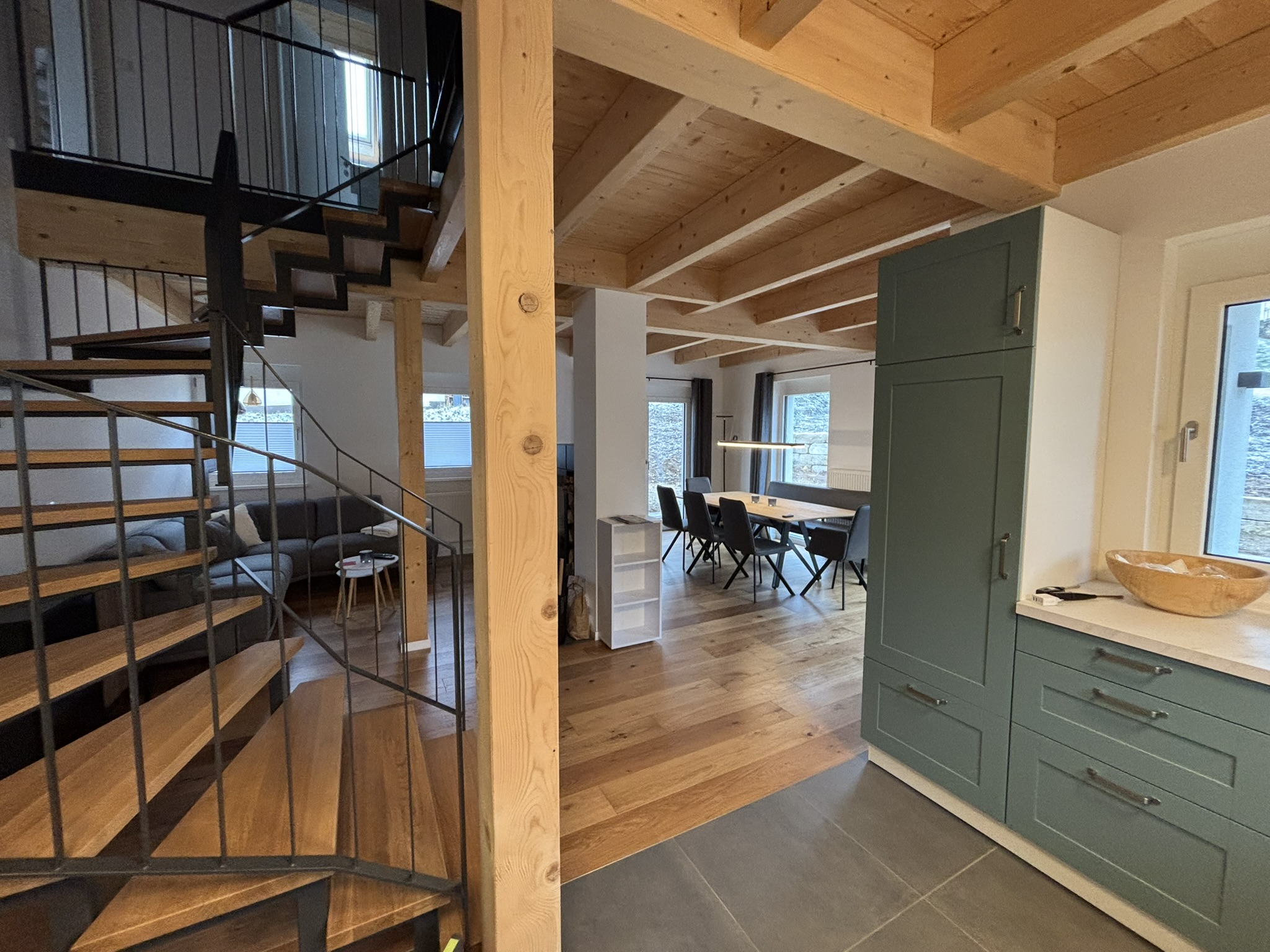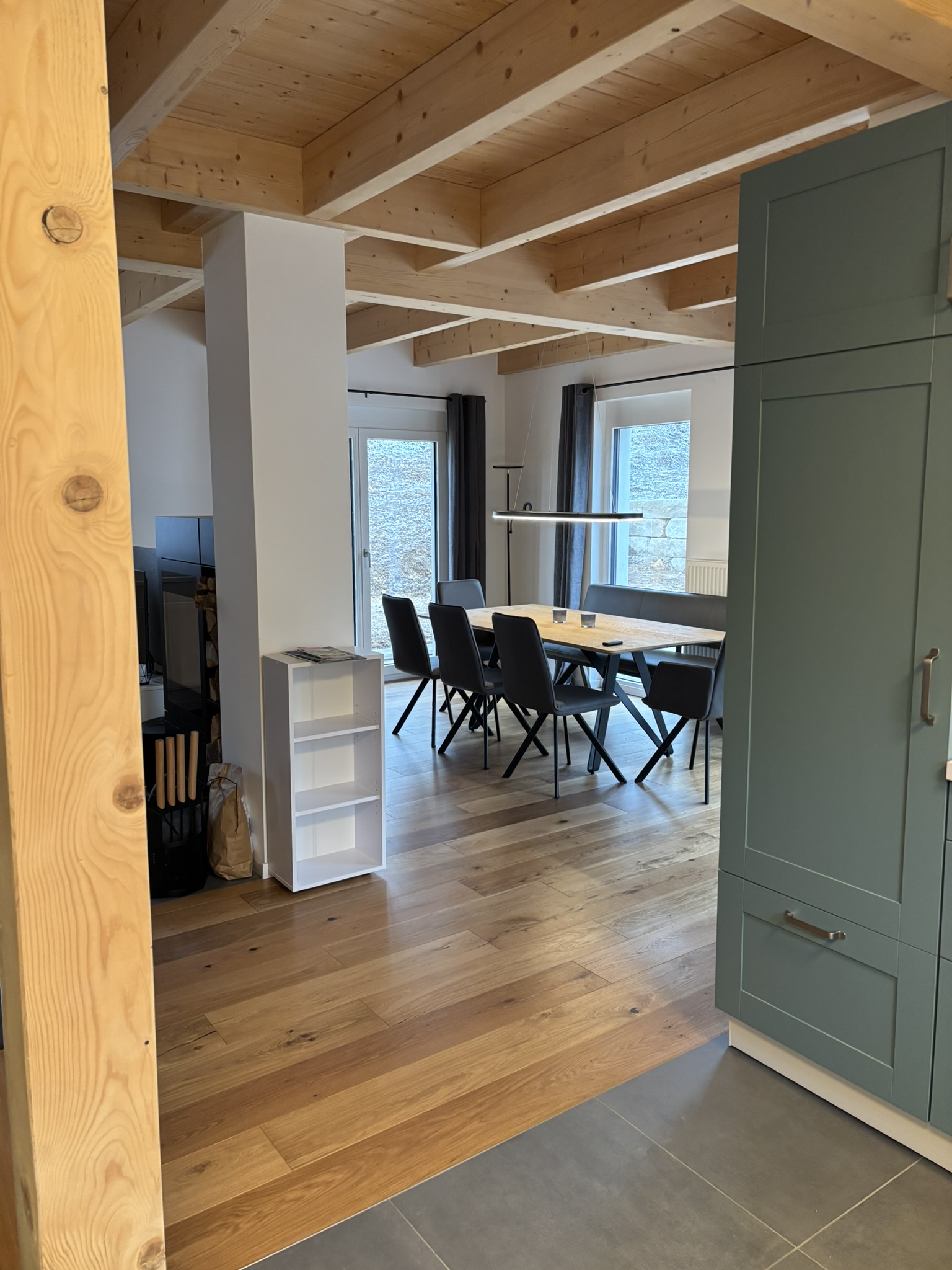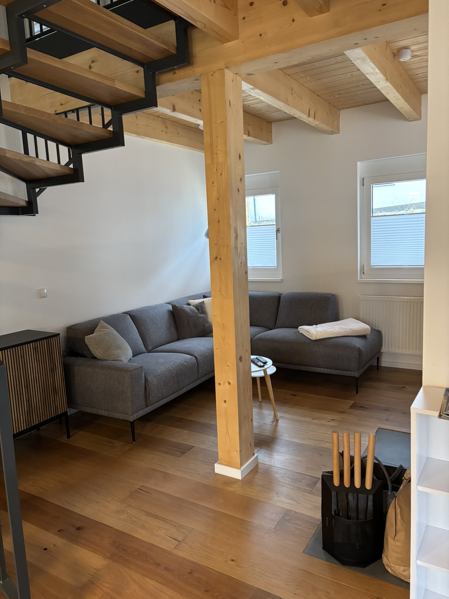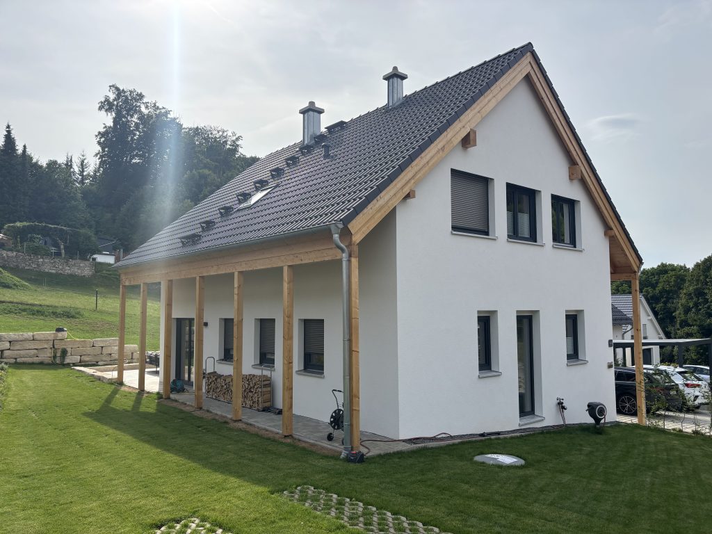 Unser Haus besticht durch eine offene Holzbauweise, die eine warme und einladende Atmosphäre schafft. Der gemütliche Holzofen im Wohnzimmer lädt zu entspannenden Abenden ein, während die Sauna Ihnen wohltuende Erholung bietet.
